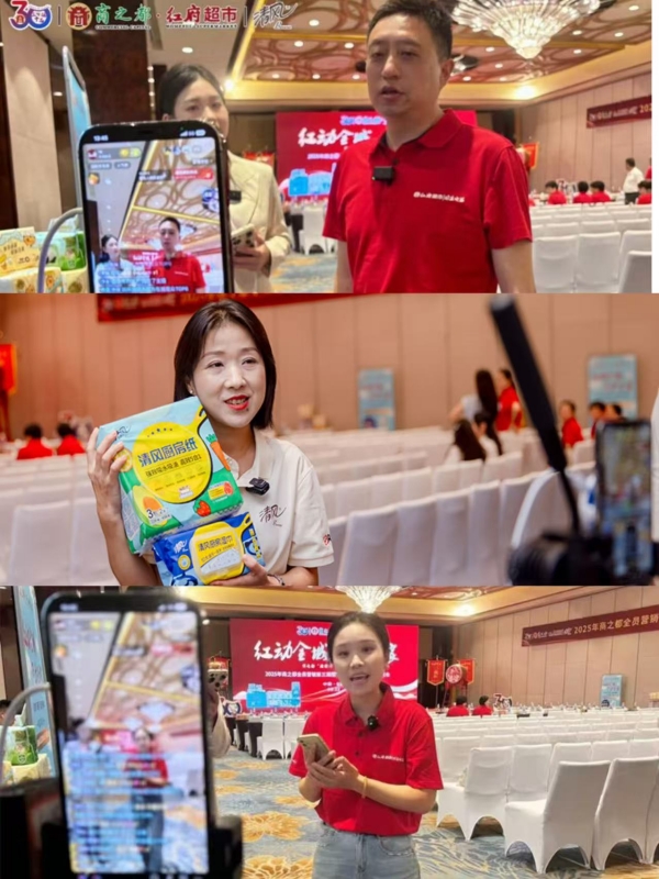直播上半場聚焦活動價值與產(chǎn)品品質(zhì)傳遞,通過實時連線帶領(lǐng)觀眾沉浸式體驗啟動會現(xiàn)場,并邀請紅府超市總經(jīng)理助理鄭遠征、安徽省辦推廣經(jīng)理陳燕、紅府運營推薦官魏杰等多位嘉賓,分別從“紅動全城——紙品節(jié)第十季”的升級福利、原料選擇與生產(chǎn)工藝、團購商品亮點等維度進行專業(yè)解讀,品牌方代表亦通過實物細節(jié)展示,進一步強化了消費者對紅府紙品的品質(zhì)信任。