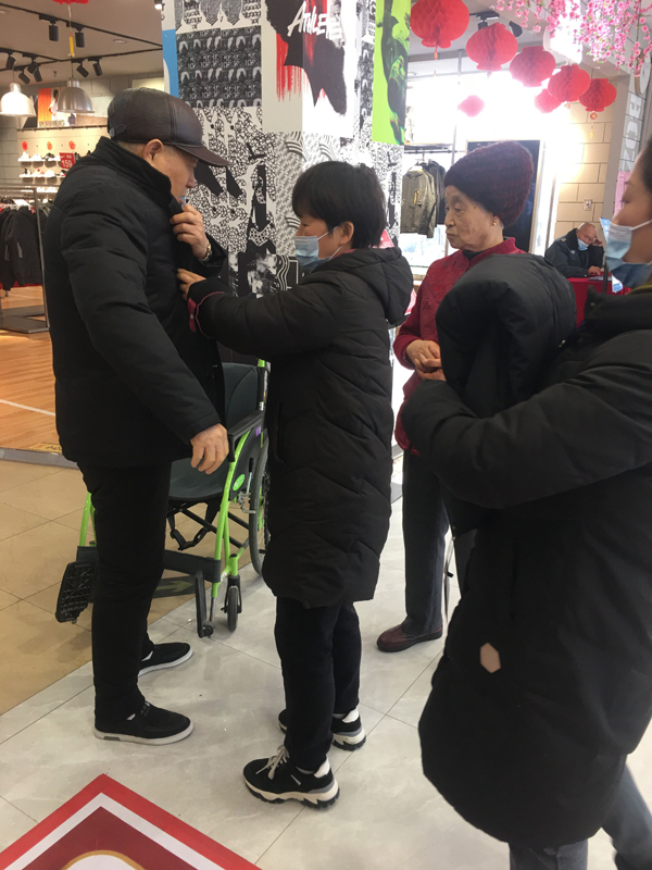 下午4時許,一對耄耋老人進(jìn)入商場內(nèi),老先生坐在輪椅上,老伴推著。在阿迪專柜旁邊的通道,老奶奶在老先生的耳邊叮囑了幾句,便徑直乘扶梯上了二樓,不一會兒“名鷹”專柜的導(dǎo)購員王芳萍陪著老奶奶下樓,手里還拿著一件棉衣。原來老奶奶是給老伴選衣服去了。王芳萍給老先生穿上衣服,詢問老先生衣服合不合身,有沒有哪兒穿著不舒服。老先生很執(zhí)拗,說自己穿的衣服好好的,家里好幾件棉衣,怎么都不愿再添新衣了,借故說衣服長度不合適推掉了。老奶奶耐心地哄著老伴,繼續(xù)到二樓賣場別的專柜挑選衣服。不一會兒,她又在“雅鹿”專柜選了一件羽絨服,導(dǎo)購員葛運運隨即另外拿了件其他的尺碼的羽絨服跟隨下樓。葛運運幫老人穿好衣服,還詳細(xì)介紹這款羽絨服填充的是今年最流行的鵝絨,不僅更保暖還很輕便,長度也剛好,不會給坐在輪椅上的老人帶來不舒服感。老人經(jīng)不住老伴的勸說,試穿比較后答應(yīng)買下。
