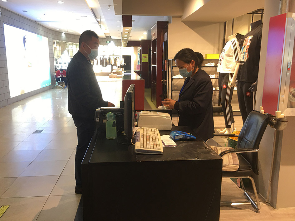 “五一”當(dāng)天,商場客流增多,服務(wù)保障部門堅守“一小時輪崗”制度,同安保人員對進店顧客進行測溫、驗雙碼、提醒規(guī)范佩戴口罩工作。