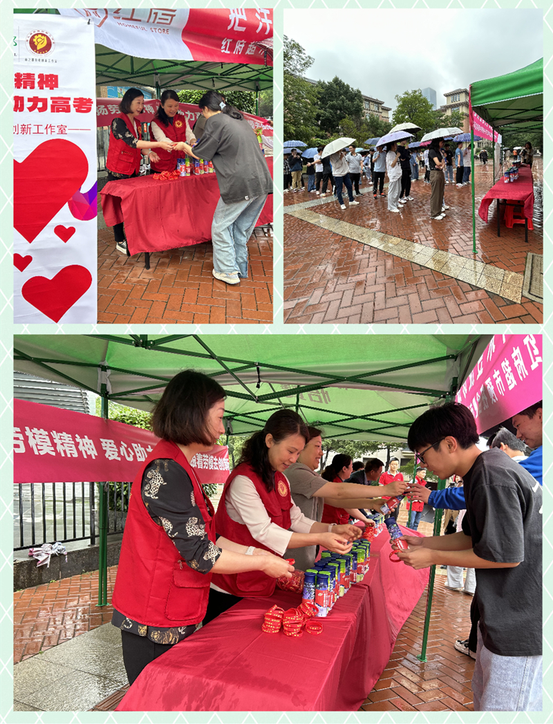 活動(dòng)當(dāng)天,工作室準(zhǔn)備了1800份送考禮包,禮包內(nèi)是營(yíng)養(yǎng)酸奶和加油手環(huán),希望通過點(diǎn)滴心意給學(xué)子們帶去一份營(yíng)養(yǎng)和鼓勵(lì)。當(dāng)日,安徽省商之都工會(huì)主席孫益梅一同前往,帶去商之都給學(xué)子們的祝福,雖然大雨滂沱,工作室的成員們依然保持熱情,積極為學(xué)子們發(fā)放禮包,整個(gè)活動(dòng)井然有序的進(jìn)行,充分展現(xiàn)了勞動(dòng)模范新風(fēng)采。