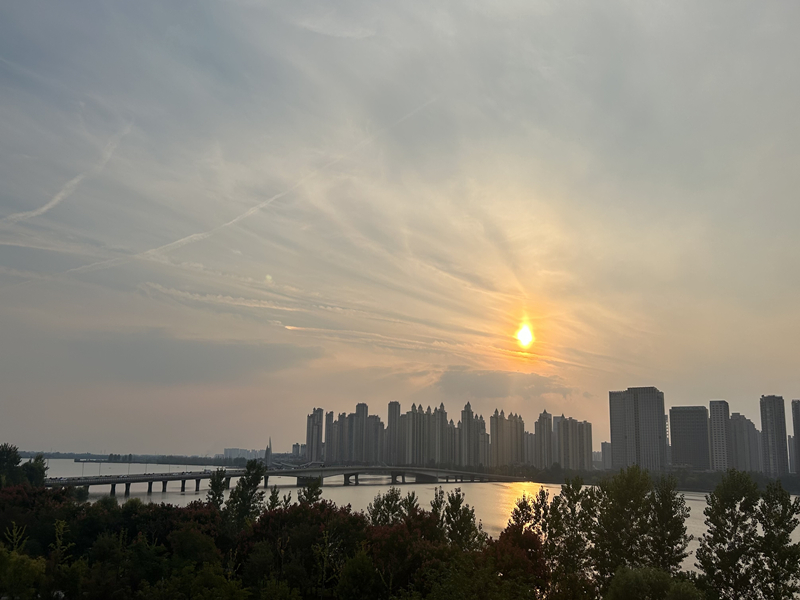 拍攝地點:龍湖公園 拍攝時間:10月11日傍晚 拍攝內(nèi)容:站在龍湖東公園高處,西邊風(fēng)景盡收眼底,落日余暉、高樓聳立映入平靜的湖水,龍湖大橋上車水馬龍連接龍湖東西岸的繁華,近處綠色成蔭,若不是秋風(fēng)吹拂涼意襲來,已然忘記已入深秋。 (文/圖 張為為)