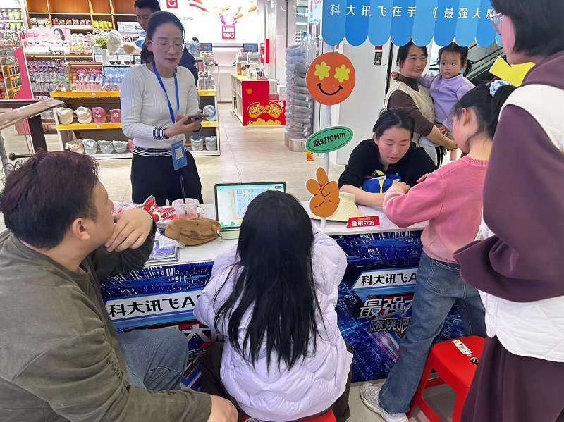 活動現場,科大訊飛的智能學習機、智能翻譯機等產品有序陳列,吸引眾多顧客駐足圍觀。工作人員熱情地為每一位顧客介紹產品功能,尤其是針對智能學習機,詳細講解其如何利用AI技術助力孩子學習,涵蓋個性化學習方案制定、海量學習資源共享以及智能輔導等功能,孩子們愉快的在學習機上學習、游戲,家長們則認真了解產品對孩子學習的幫助。