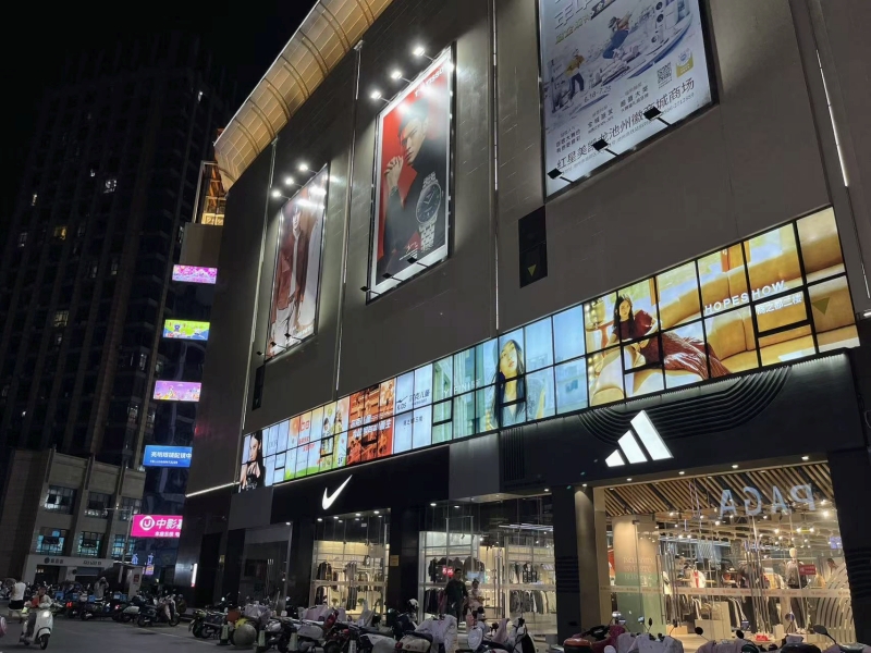 外立面亮化改造工程,對約7000㎡的外立面進行深度清潔與修繕,增設近景輪廓燈、門頭檐燈等亮化設施。工程盤活閑置櫥窗改造為主題燈箱-百牙路一側聚焦品牌展示,烘托購物氛圍;長江路一側融入九華山、秋浦河、杏花等本土文化元素,讓商業(yè)建筑成為展示窗口。同時,拆除直梯原鋼架廣告牌,更換為逐層展示場內(nèi)品牌的燈箱,兼顧亮化與宣傳功能。目前已完工并進入驗收階段。